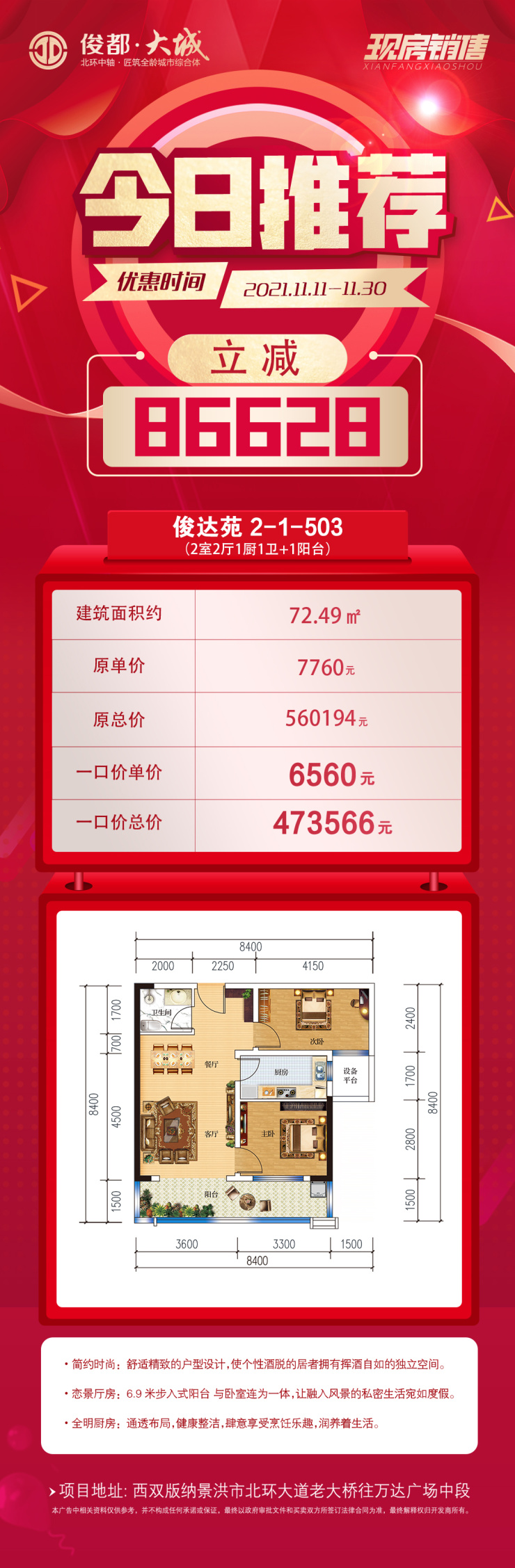 俊都大城今日推荐特价好房 俊达苑约72㎡方正2室2厅,城芯现房,抄底特价约47.3万,立减86628元。 俊都大城,诚邀亲鉴。