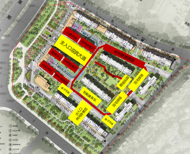 8、全零段运动场所分布社区各个角落,环形健康跑到,双羽毛球场,约400㎡集中运动场等;
