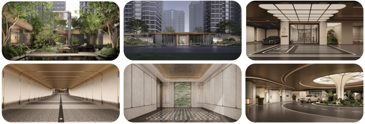 以小区车马驿站、地下车库电梯厅、单元门厅、私人电梯厅、入户门厅为节点打造的五重归家礼序,搭配五星级入户体验,实现移步易景的景观体验。