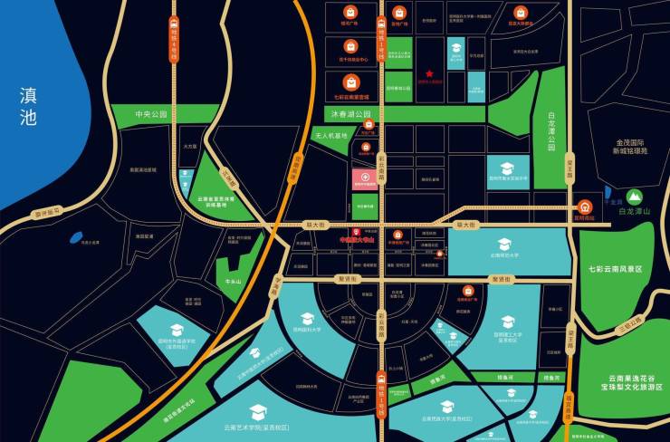 项目周边有六大公园,洛龙湖公园,白龙潭公园,春融公园,春城公园,呈贡中央公园(约5100亩,距项目约900米),中央公园(距离项目步行15分钟),捞鱼河湿地公园。