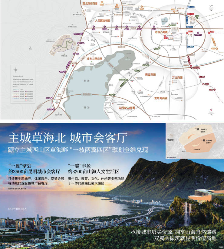 项目踞立主城西山区草海片区,受益于约3500亩昆明城市会客厅与3200亩山海人文生活区双重规划叠加辐射,承接城市塔尖资源,拥享山海自然馈赠,筑就昆明价值高地。