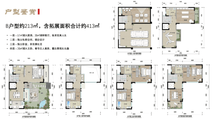 产品:A户型:190㎡产权面积约280㎡;B户型:213㎡产权面积约310㎡;C户型:303㎡产权面积约490㎡