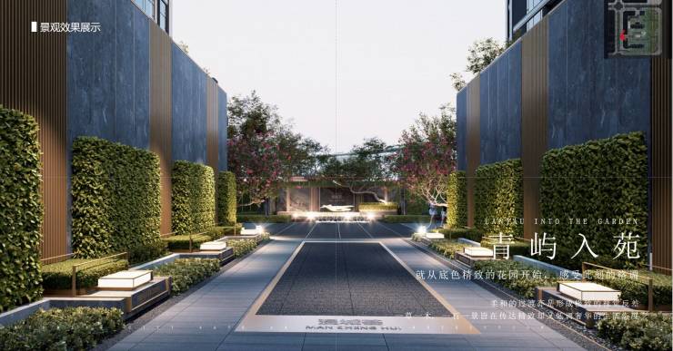 •东大门入户从公园里归家(东边规划约4000方市政景观公园),采用高绿篱及氛围灯饰形成被自然包裹的归家场域,给人一种温馨而又高级的居住环境。