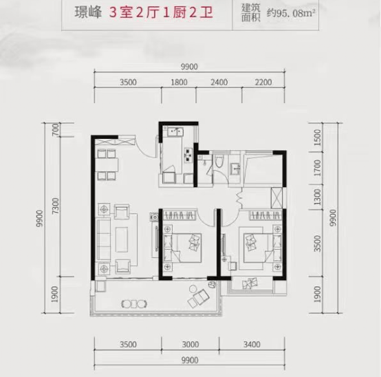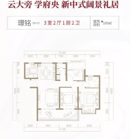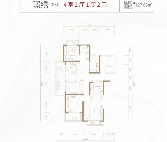 在售户型: 95㎡(三室两厅一厨一卫)、105㎡(三室两厅一厨两卫)、127㎡(四室两厅一厨两卫 )