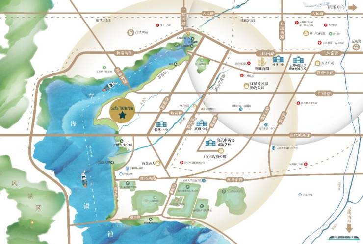 交通:广福路、环湖路、西福路、日新路、滇池路、南绕城高速等城市脚桶干道环绕,地铁5号线、10条公交线路绿色出行,多维交通畅达全城。