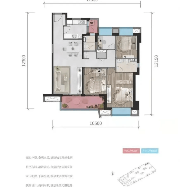 C户型115㎡,三室两厅两卫