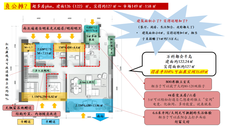 得房率约101%-105%,实得大于建面、85%以上非承重墙空间改造更多变,约80%储藏空间,万科越级功能王产品。