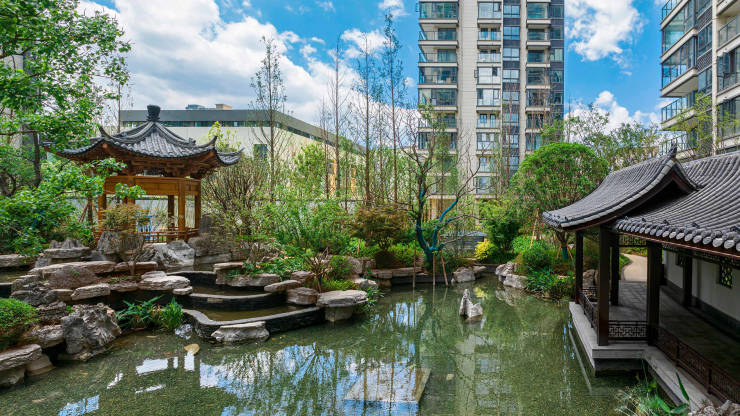 透过玻璃,中式园林的山水大观跃然眼前,引领您步入一个诗意盎然的世界