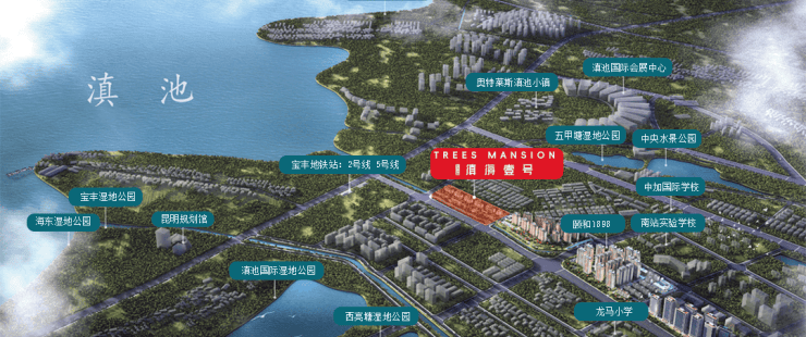 项目位于昆明会展片区,整个片区以“飞虎大道”为中轴,往北承接巫家坝机场片区延伸至广福路,南至滇池沿岸,西至星海半岛西侧,东至宝丰半岛东侧,整体地势开阔平整,是昆明市主城区稀缺的可完整连片开发区域。同时片区毗邻滇池、远眺西山,多个湿地公园萦绕,自然景观生态资源丰富,且片区内多为低密度项目,整体宜居度在昆明首屈一指。