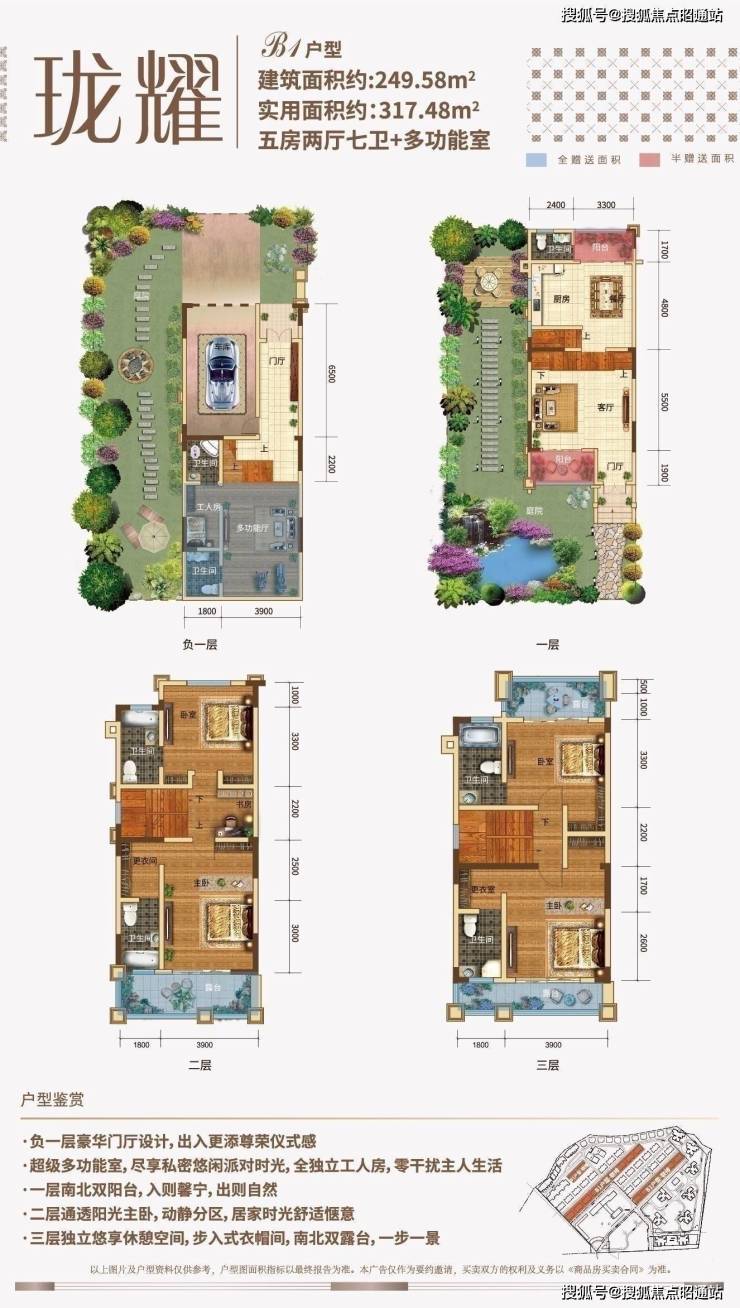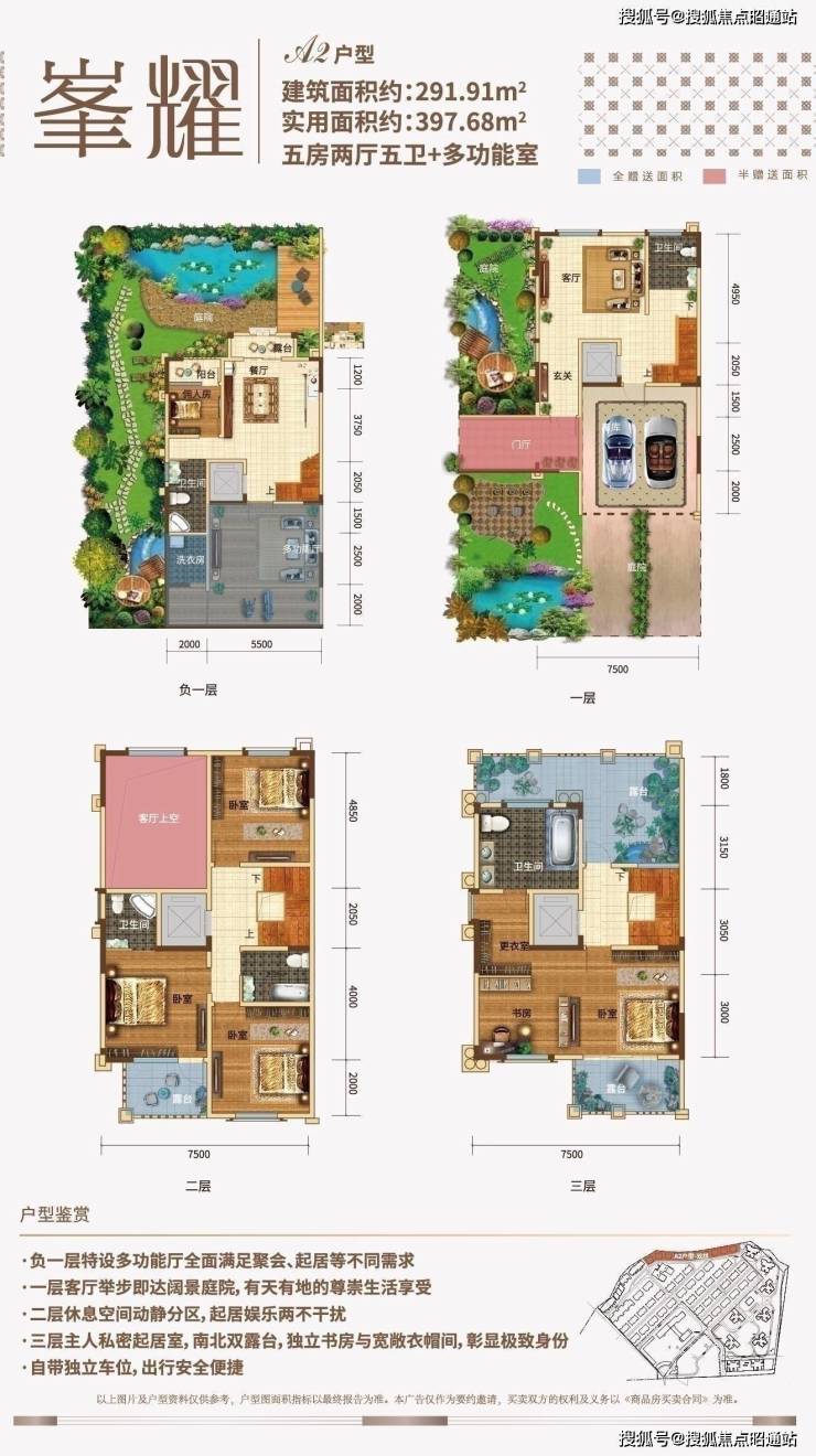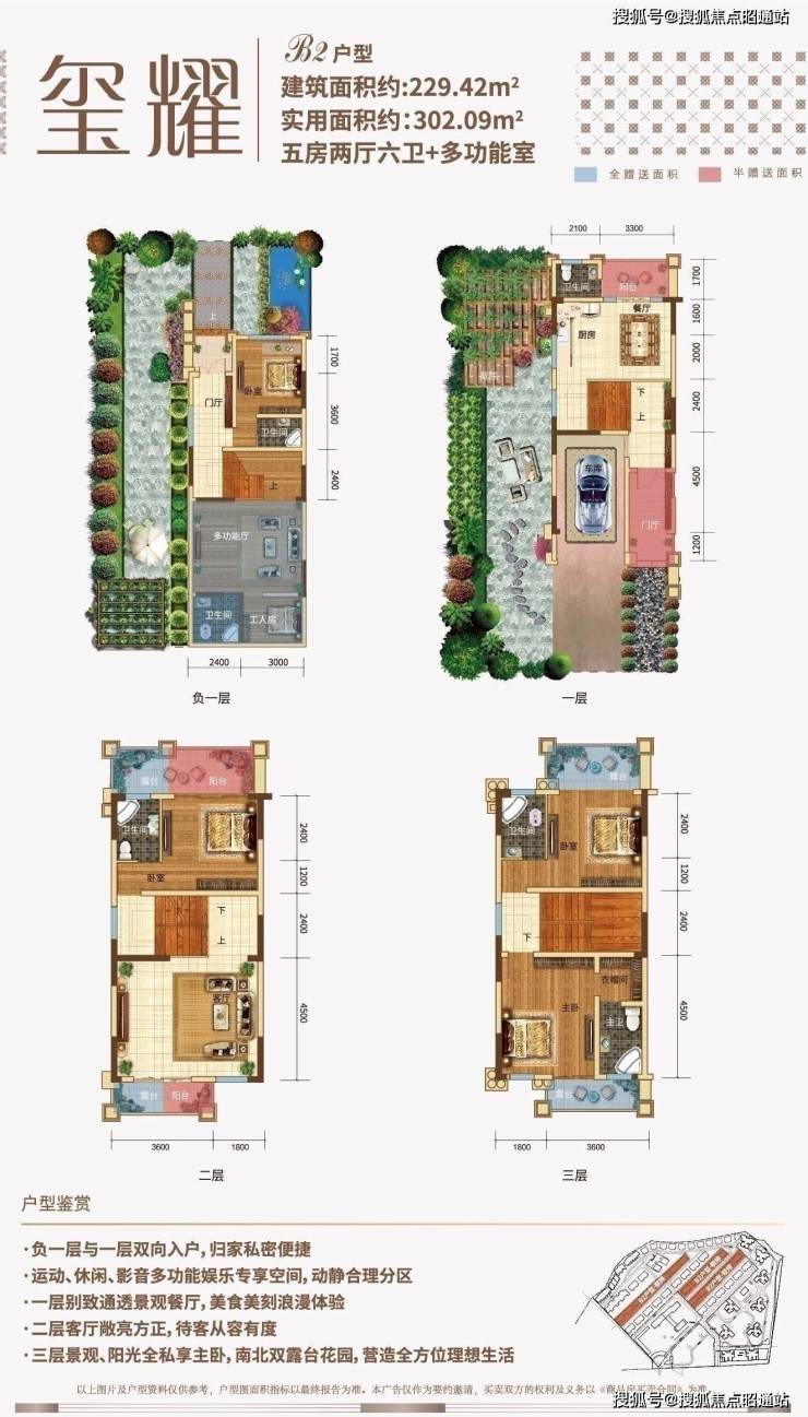 目前市面上少有的双拼产品,除了前后花园外,带有电梯入户,同样是地下1层地上3层的结构,户型面积290㎡,地下室赠送约45㎡,露台阳台赠送约61平米,前后花园赠送面积约220㎡。
