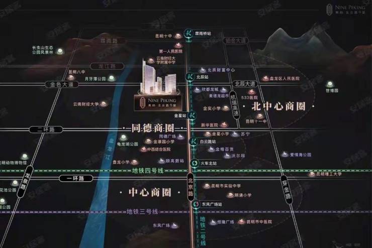 屹立北京路金刀营,昆明城市中轴线上;紧邻地铁2号线金星站、北辰站 邻近同德广场、北辰财富中心;与明通小学、金实小学为邻;优享市一人民医院、云南省中西医结合医院;近揽盘龙江、月牙潭、龟龙湖生态美景