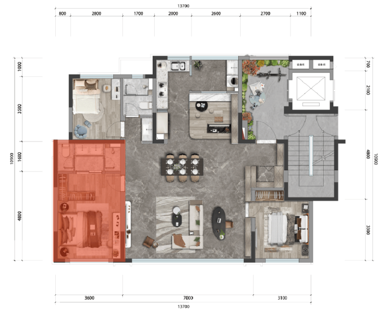 ③拆掉公区卫生间,让餐客厅升级为55㎡超大空间(独栋别墅才享有的大空间)