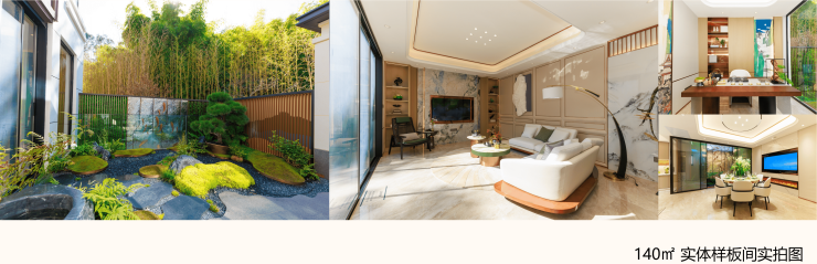 阔景入园:47米宽,5.7米高新中式入园大门,白色石砖与咖色金属搭配塑造现代中式大气磅礴的尊贵入户体验。