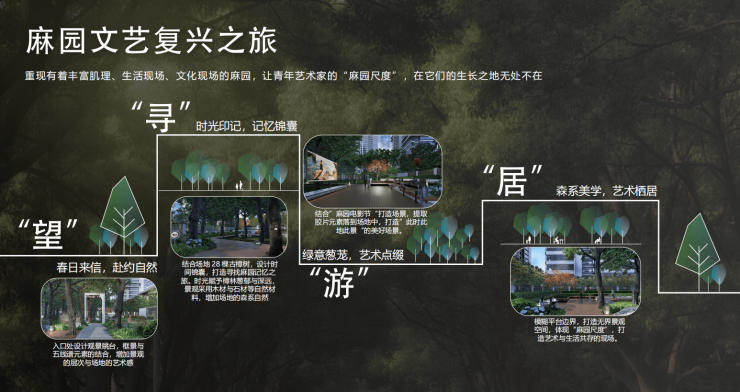 结合现状场地,保留28棵古樟树,运用现代设计手法表现“森系艺术社区”的自然气质,结合“森系”与“艺术”的景观设计理念,延续生态基底,融入艺术美学,打造品质奢享、森系共融的社区。