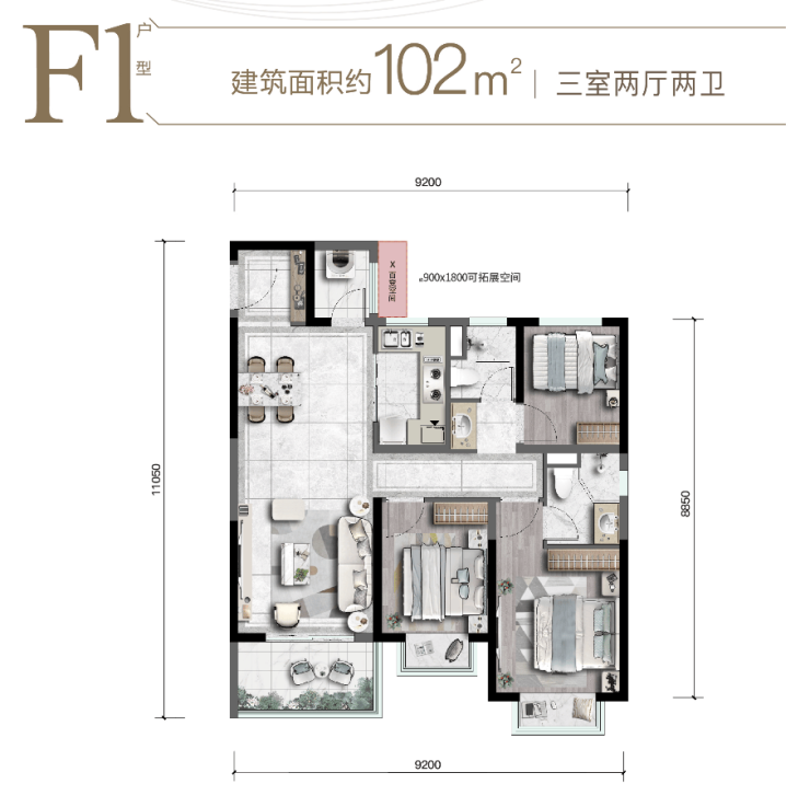 空间升级:双阳台设计、92-102m²X百变可拓展空间、可做功能阳台&卫浴、2.4米入户门(比行业标准高20cm)
