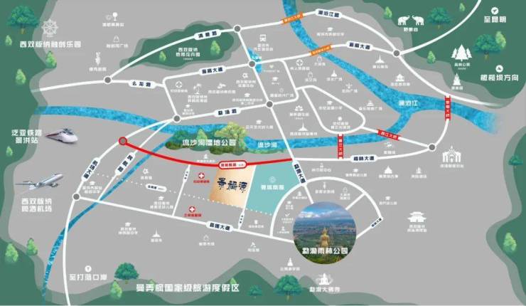 项目毗邻勐泐雨林公园、千年傣王宫、勐泐大佛寺(4A)、流沙河湿地公园、民族博物馆、总佛寺、曼贺纳自然村寨,景观资源环绕,睁开眼便是优美风光。