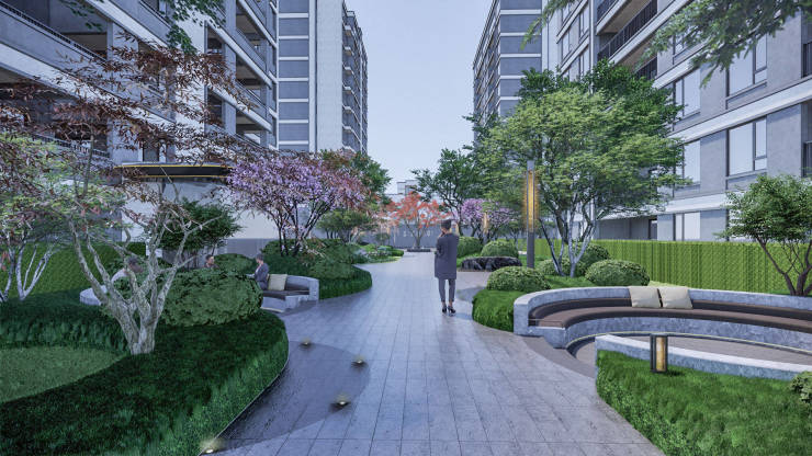 「九曲五境·山水栖居 」——归家动线升级、景观节点升级、互动空间升级。以一条核心归家轴、五大景观节点、全龄全域游乐场景,升级滇海社区景观体验。