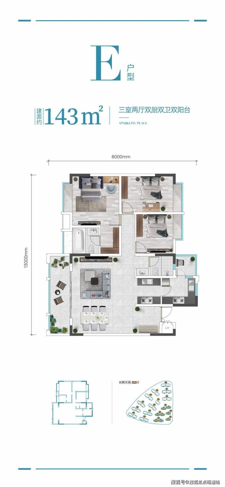 143㎡三房两厅双厨双卫双阳台,奢阔超大阳台空间,采光采阳充足,大三房设计,居住舒适度高,主卧豪华套房式设计带独立衣帽空间,双厨房配置烹饪空间更得心应手,厨房直连生活阳台洗晒便利