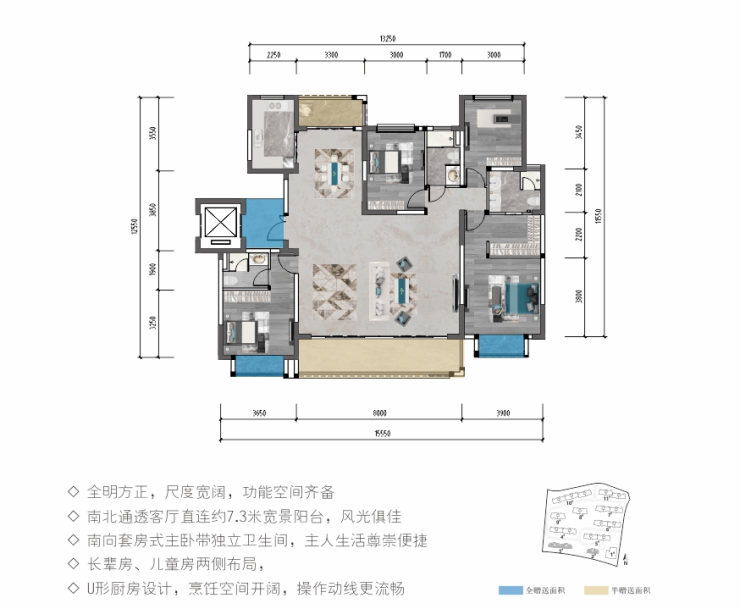 全系南向三面宽设计,宽景阳台,套房式主卧、多功能房等标配空间