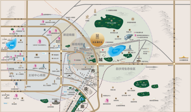 项目约3公里范围内:近享新迎新城、瑞鼎城等城市新兴商业中心,世博园、西南林业大学、盘龙区人民医院等城市生态、文化配套。