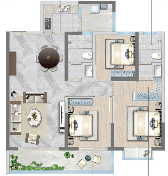 A2户型:建面约107㎡(三室两厅两卫)