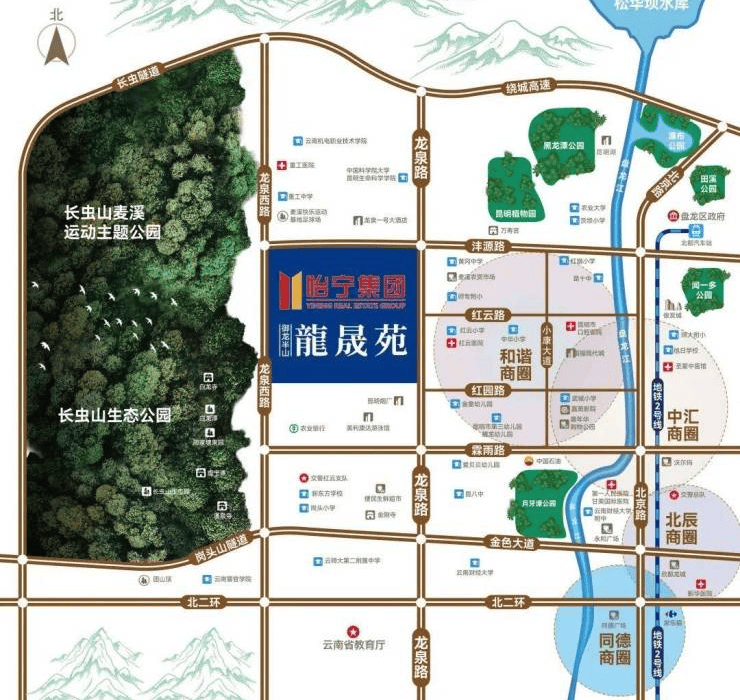 生态:项目坐拥约3300亩长虫山生态公园,尽享纯天然负氧离子氧吧,周边有五大主题公园环绕(长虫山运动公园、昆明市植物园、黑龙潭公园、麦溪运动主题公园、月牙潭公园),北市区的城市绿肺,让您的生活每天都充满了绿色。