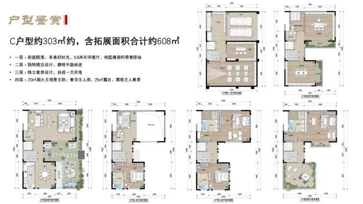 产品:A户型:190㎡产权面积约280㎡;B户型:213㎡产权面积约310㎡;C户型:303㎡产权面积约490㎡