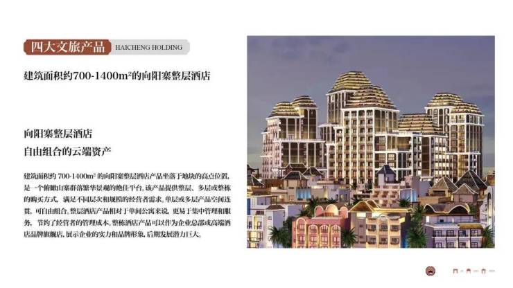 海诚控股始创于2000年,旗下设“海诚开发、创基建设、景兰文旅、海川园区、佳和物业”五大专业化集团,所辖各类分子公司近百家。已成功投资开发、建设、运营西双版纳告庄西双景、老挝磨丁经济特区、澄江抚仙湖·广龙小镇等多个根植于自然与城市文脉的文旅地标作品及产业型新城。是一家追求卓越、积极创新的多元化企业集团。