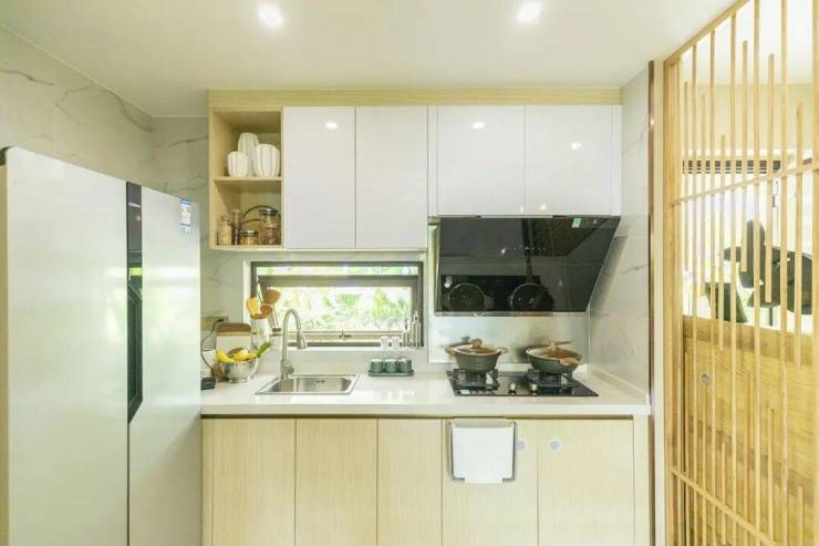 50余处人性化精装设计,精工细琢:指纹密码锁、USB插座、厨房台面挡水槽设计、抽拉式水龙头、智能抽油烟机、不锈钢挡油版、锡箔纸防潮、浴室柜灯带、通体大理石瓷砖、无纺布植物纤维壁纸、纯天然竹地板、超2.4m阳台设计搭配塑木地板+青石板+鹅暖石…