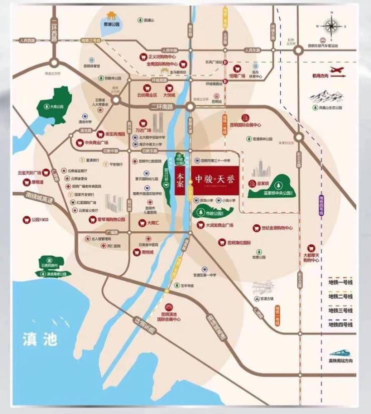 地铁:地铁2号线小街站下楼即享 路网:三横(二环南路,日新路,广福路)三纵(前兴路,官南大道,北京路南延线),10分钟到达海埂公园,10分钟至南亚、万达商圈30分钟至机场,高铁站