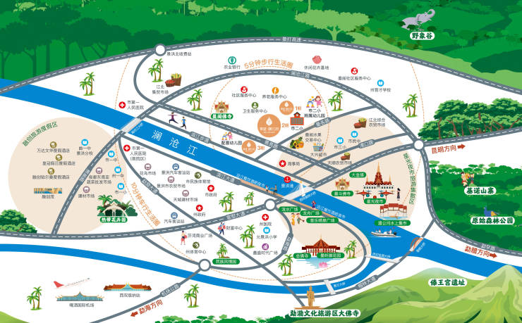 ?【枢纽交通】华夏·御江府处于江北的交通核心枢纽,直线距离约1公里可到达新修建的景海高速,通往打洛方向,出入境十分便利;往西直线距离约3公里可到达融创茂;往东直线距离约2.5公里可到达网红打卡地星光夜市;往西直线距离约6公里可到达嘎洒国际机场及泛亚高铁站;北侧的澜沧江路和南侧的景亮路连通西双版纳大桥与老大桥,可到达勐泐大佛寺、曼厅公园、热带花卉园等城市公园.