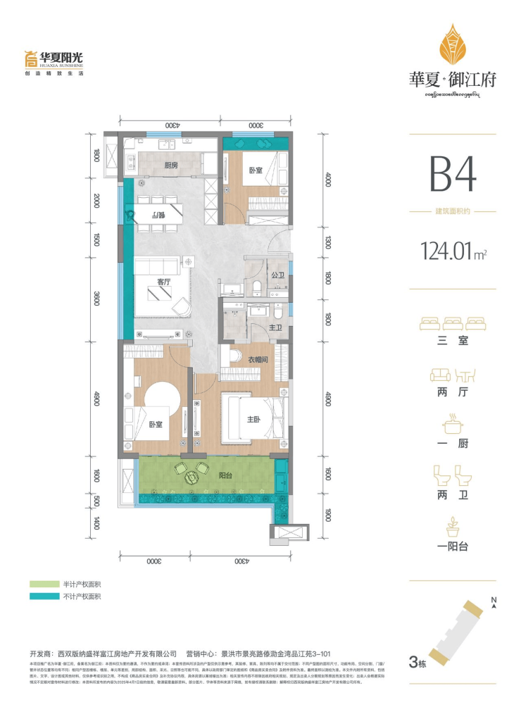 B4户型建筑面积124.01平(阳台半面积+花池全面积+飘窗赠送面积+其他)共计赠送约16.09平。