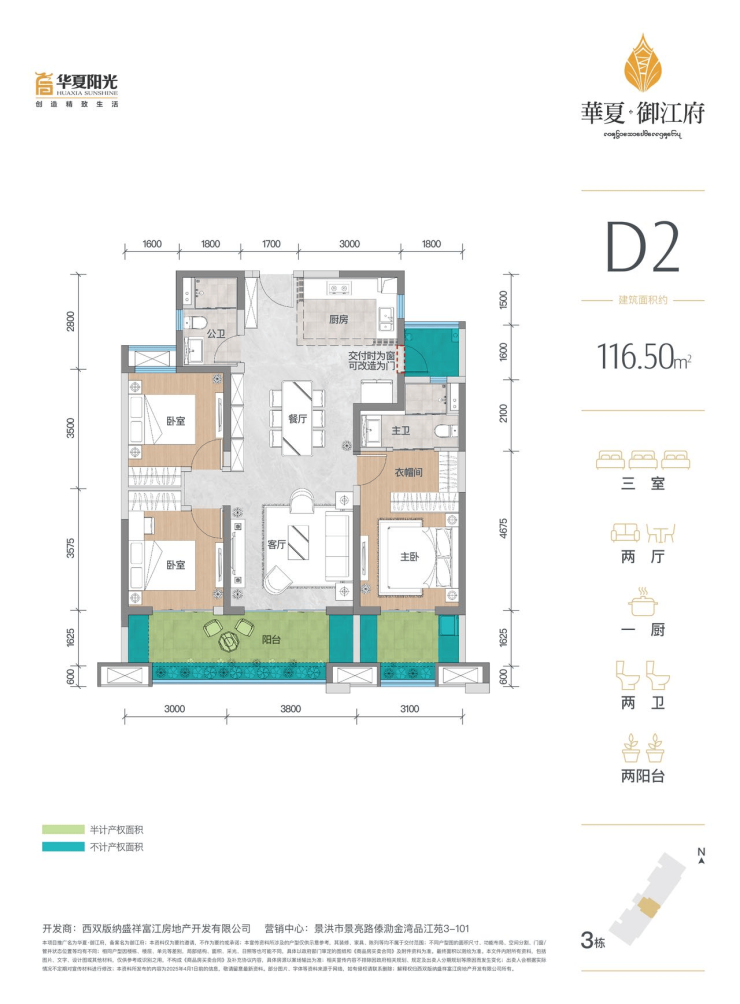 D2户型建筑面积116.5平(阳台半面积+花池全面积+飘窗赠送面积+其他)共计赠送约16.49平。
