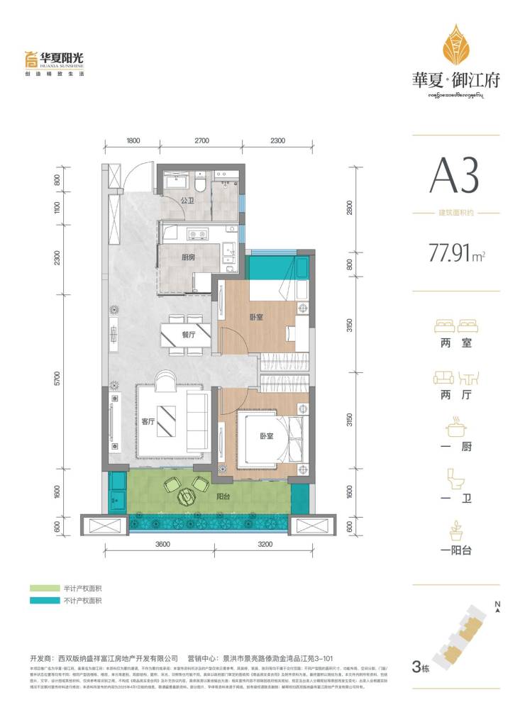 A3户型建筑面积77.91平(阳台半面积+花池全面积+飘窗赠送面积+其他)共计赠送约11.37平。