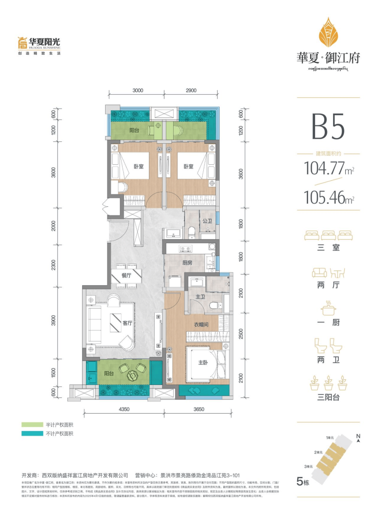 B5户型建筑面积104.77/105.46平(阳台半面积+花池全面积+飘窗赠送面积+其他)共计赠送约14.69平。